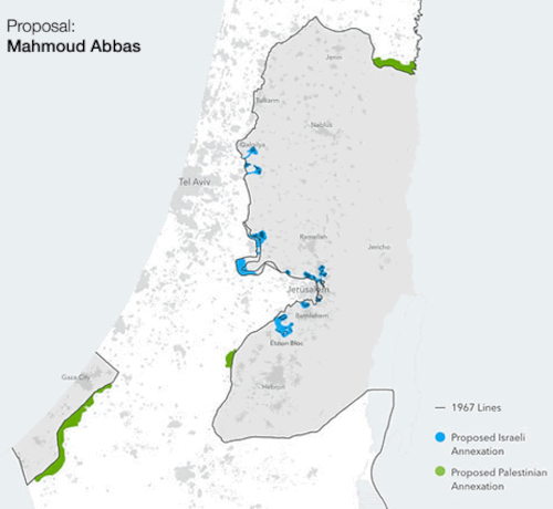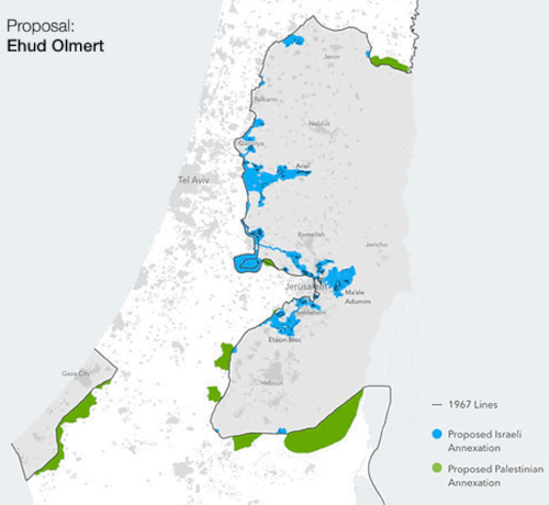 Oferta israelí en 2008. Obsérvense los cambios mínimos de fronteras respecto a 1949-67.