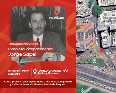 Hoy, viernes 19 de diciembre, a las 11.00 horas, el Partido Colorado invita a la inauguración de este espacio urbano, en pleno Barrio Sur, que tributa homenaje a Jorge Sapelli, vicepresidente de la República que supo mantener en alto la bandera de la institucionalidad democrática en tiempos en que la Constitución era arrasada desde el propio Poder Ejecutivo, negándose a legitimar con su presencia la institucionalidad farsesca de la dictadura.