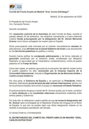 La carta enviada por el Comité del Frente Amplio en Madrid a la Cancillería uruguaya, solicitando la revisión de la designación del embajador Bernardo Greiver por su "carácter marcadamente sionista", carece de pruebas concretas y es un ataque infundado, claramente basado en el carácter judío de Greiver, constituyendo —por tanto— una acción puramente antisemita. |