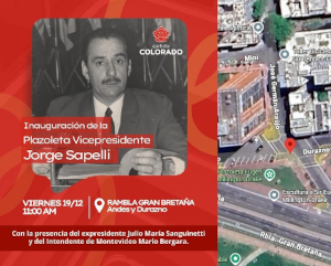 | Hoy, viernes 19 de diciembre, a las 11.00 horas, el Partido Colorado invita a la inauguración de este espacio urbano, en pleno Barrio Sur, que tributa homenaje a Jorge Sapelli, vicepresidente de la República que supo mantener en alto la bandera de la institucionalidad democrática en tiempos en que la Constitución era arrasada desde el propio Poder Ejecutivo, negándose a legitimar con su presencia la institucionalidad farsesca de la dictadura. |