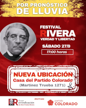 Este sábado 27, a las 17 horas, en la Casa del Partido Colorado, se llevará a cabo el Festival “Rivera, Libertad y Verdad”, para rendir homenaje al caudillo fundador del Partido Colorado y precursor de la independencia de la República, a 200 años de la decisiva Batalla del Rincón. |